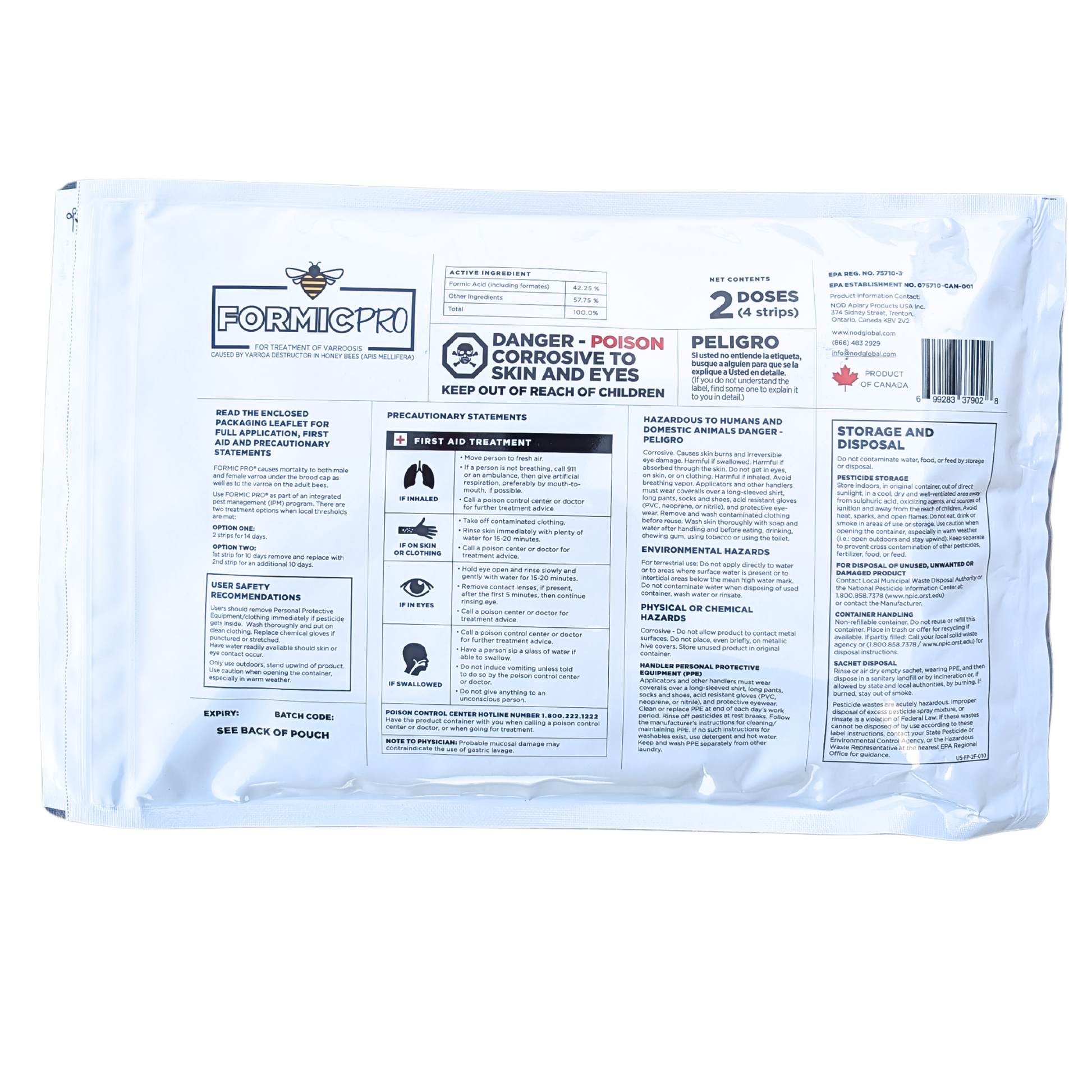 Formic Pro is an effective organic solution for controlling Varroa mites in beehives. Using formic acid, it works during honey flow and is safe for honey intended for human consumption. Formic Pro’s slow-release formula eliminates mites in both adult bees and capped brood cells by penetrating the brood cap to protect growing baby bees in the pupal stage. Formic Pro can be applied to single or double brood chamber hives.